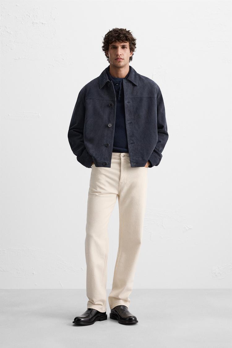 Bottom: Cream chinos with brown suede moccasins.