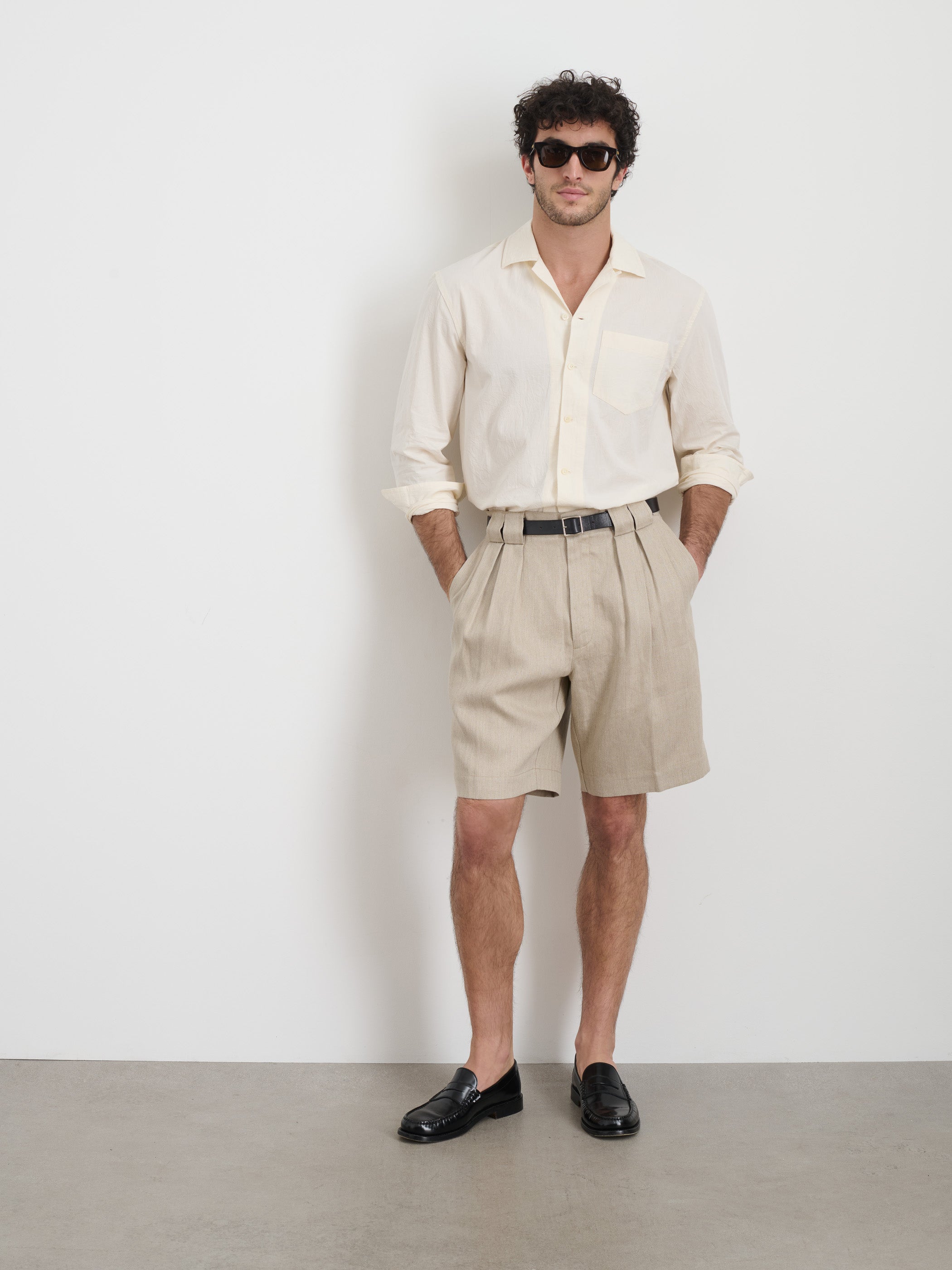 Beige short-sleeve shirt rests loosely over sand-colored shorts. Slip-on leather shoes hum gentle city rhythm. Sunglasses perch for effortless charm.